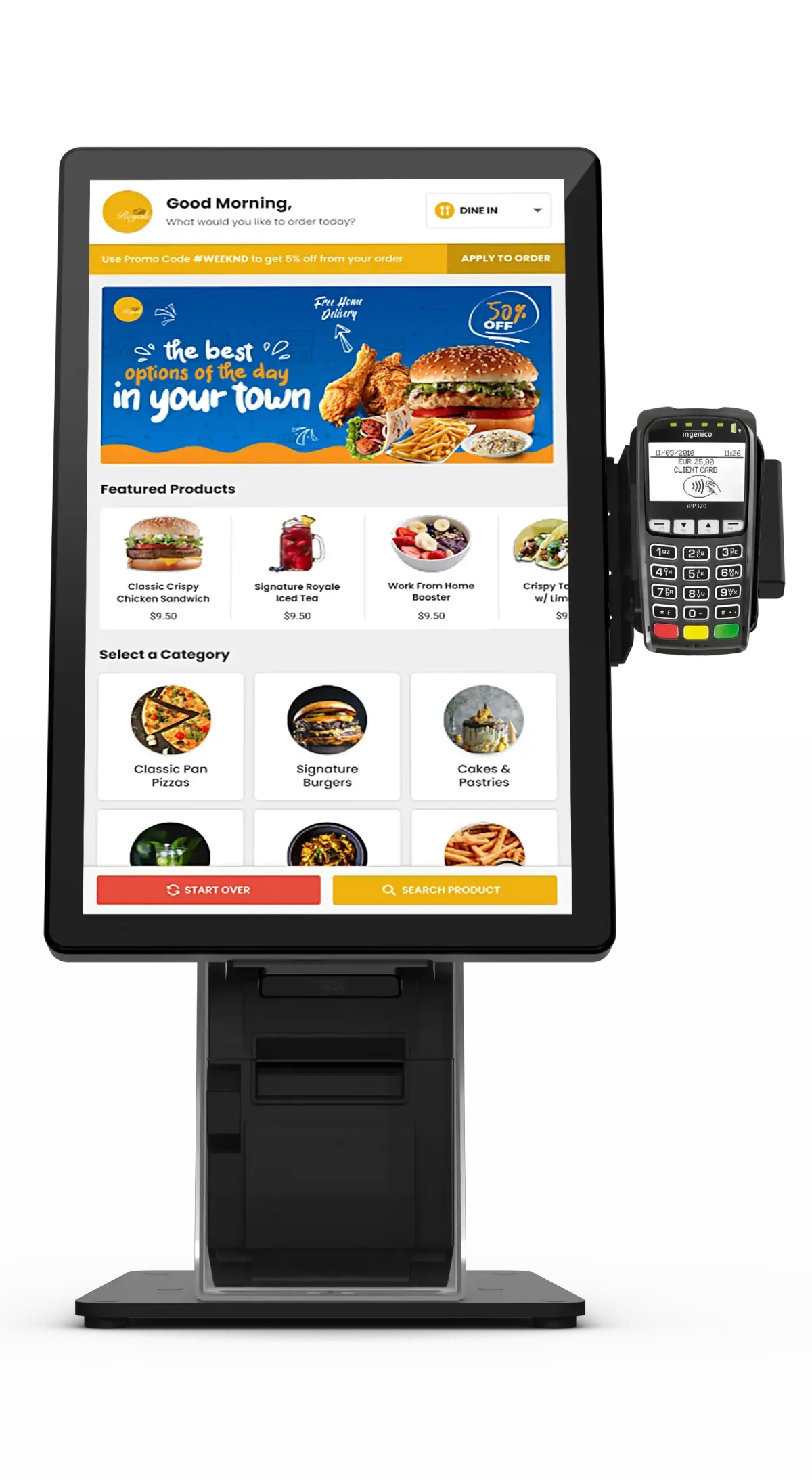The AI-powered recommendation is an inbuilt feature in VH-PAYMENTS Restaurant Self-Service Kiosk. The recommendations are based on past customer purchases, making the self-serve kiosks recommend the relevant products.